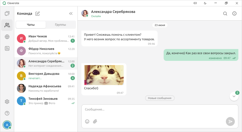 А вы знали, что вы можете использовать Cleversite, еще и как корпоративный мессенджер? Ваша команда может общаться между собой прямо в Пульте оператора для быстрого и удобного решения внутренних вопросов и задач, связанных с клиентами. При этом не нужно тратить время и переходить в другие мессенджеры. А вся переписка, конфиденциальные данные и важные документы останутся внутри компании в подконтрольном вам инструменте.