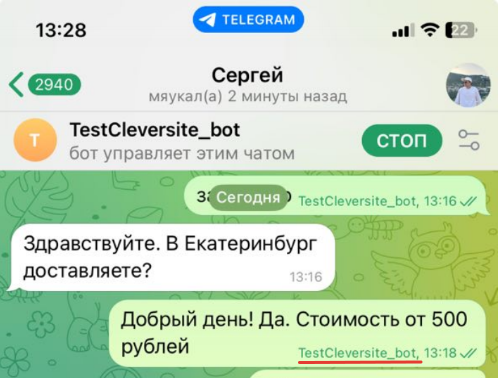 - 3В сообщениях, отправленных через интеграцию, будет указан бот как отправитель. Бот в качестве отправителя отображается только для владельца аккаунта, у клиента будет обычное сообщение.