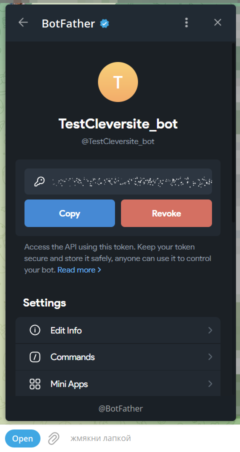 - 2Задайте боту имя и после создания скопируйте токен по кнопке Copy или кликнув на поле с ключом